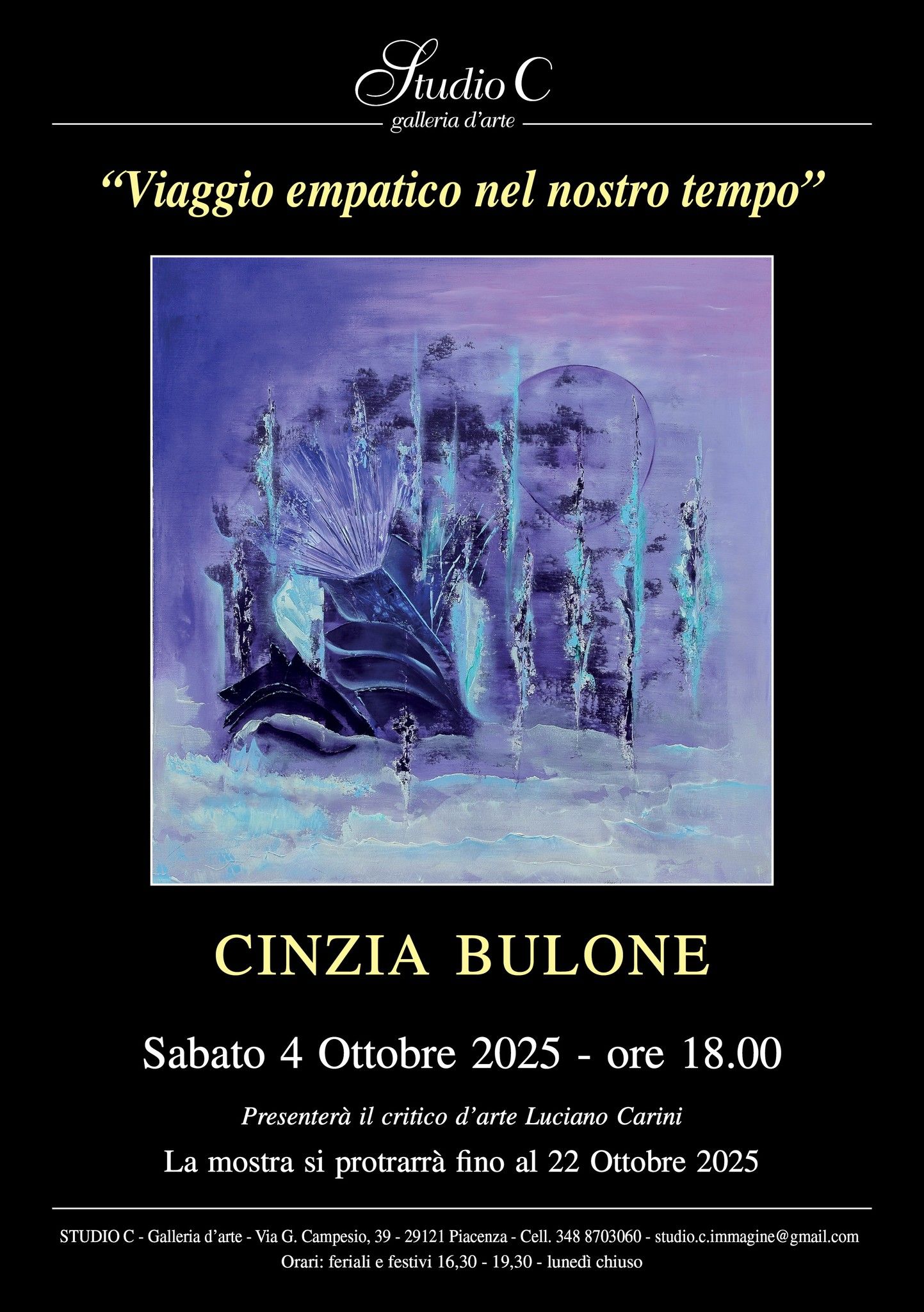 Sabato 4 ottobre alle ore 18.00, la Galleria d’Arte Contemporanea Studio C di Piacenza inaugura la mostra personale di Cinzia Bulone, dal titolo “Viaggio empatico nel nostro tempo”.