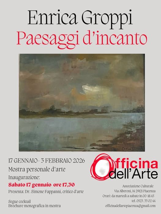 Sabato 17 gennaio, alle ore 17.30, presso l'Officina dell'Arte di via Alberoni 14, si inaugura la mostra personale "Paesaggi d'incanto" della pittrice lodigiana Enrica Groppi.