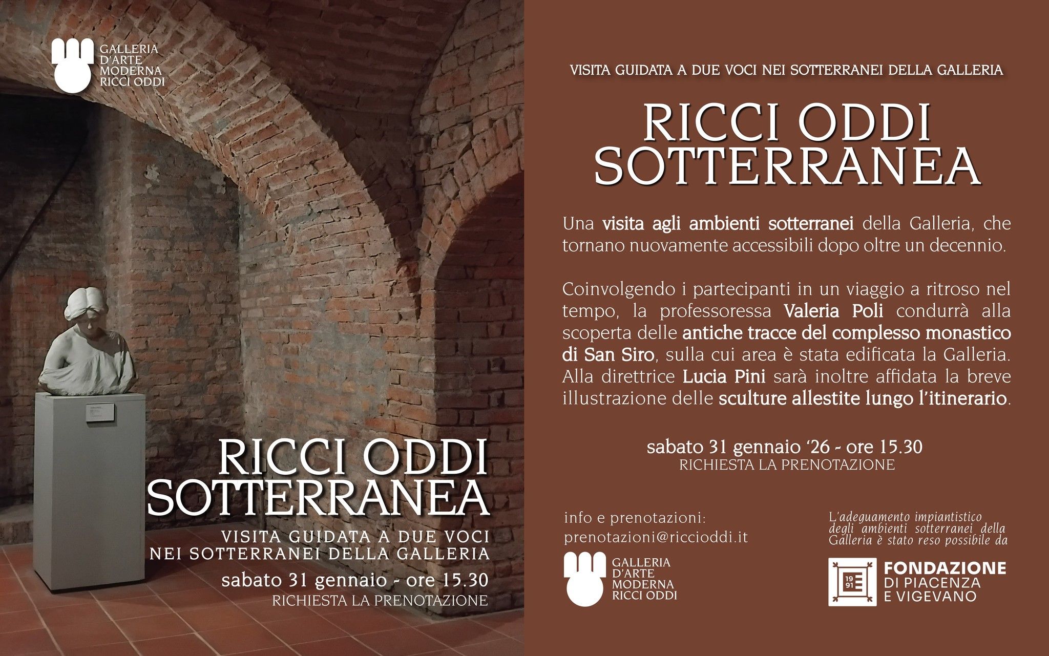 Sabato 31 gennaio, alle ore 15.30, la Galleria d’Arte Moderna Ricci Oddi propone Ricci Oddi sotterranea, una visita guidata a due voci negli ambienti sotterranei della Galleria, tornati accessibili dopo oltre un decennio.