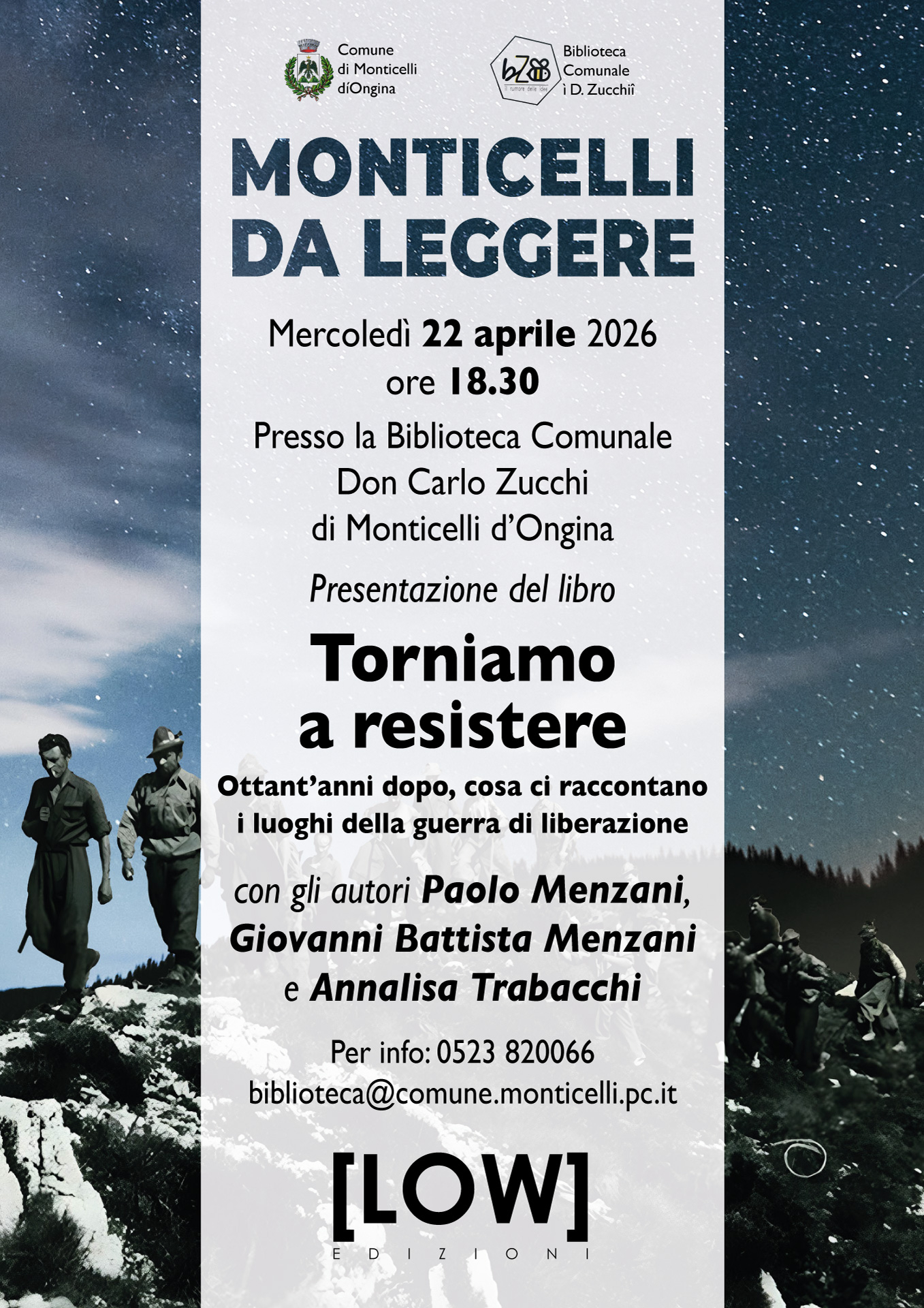 Mercoledì 22 aprile alle ore 18.30, alla Biblioteca Comunale Don Carlo Zucchi di Monticelli d’Ongina, si tiene la presentazione del libro "Torniamo a resistere", nell’ambito della rassegna Monticelli da leggere.