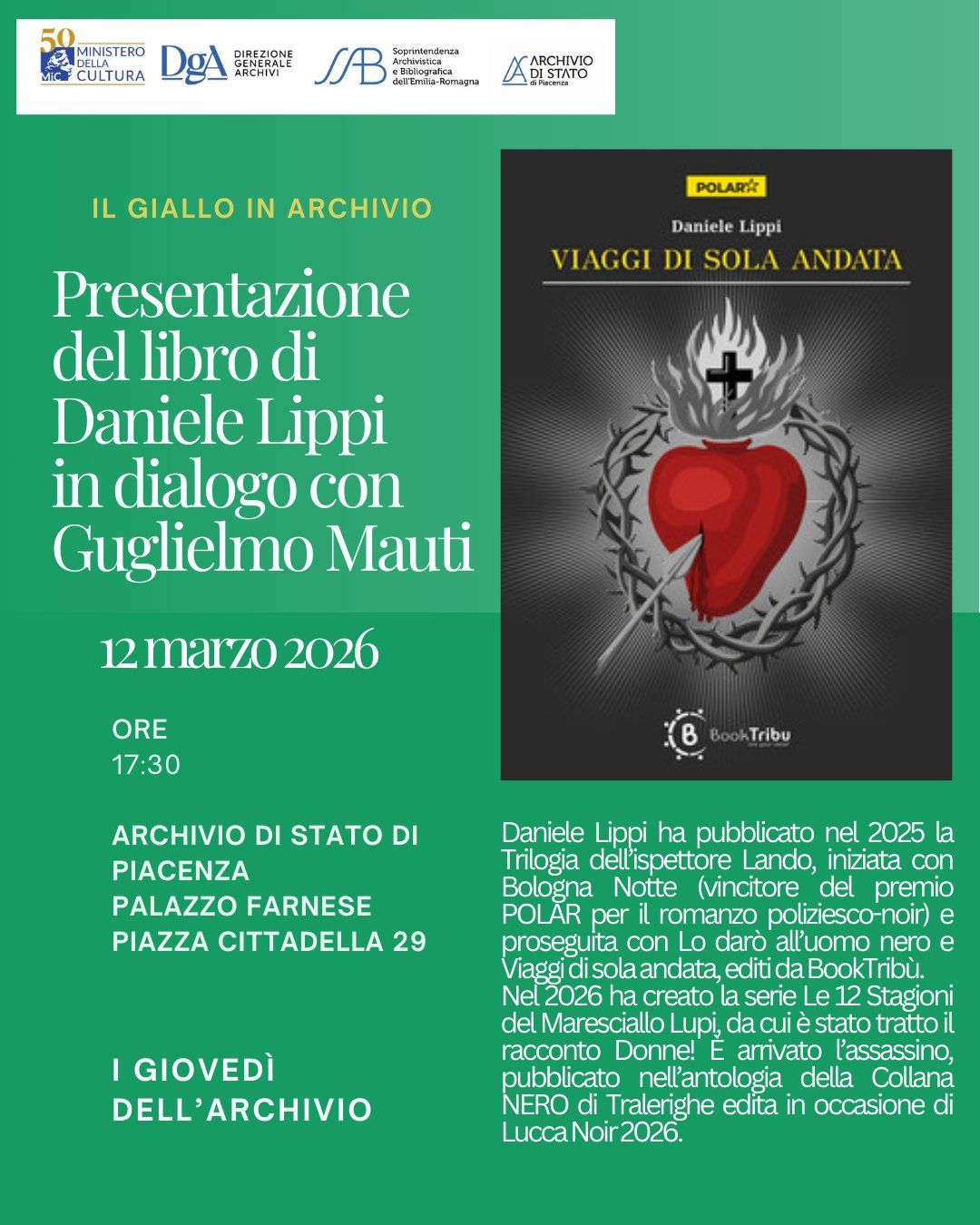 Giovedì 12 marzo alle ore 17.30, all’Archivio di Stato di Piacenza (secondo piano di Palazzo Farnese), si terrà un nuovo appuntamento con "I Giovedì dell’Archivio – Il giallo in Archivio", con la presentazione del libro Viaggi di sola andata di Daniele Lippi, in dialogo con Guglielmo Mauti.
