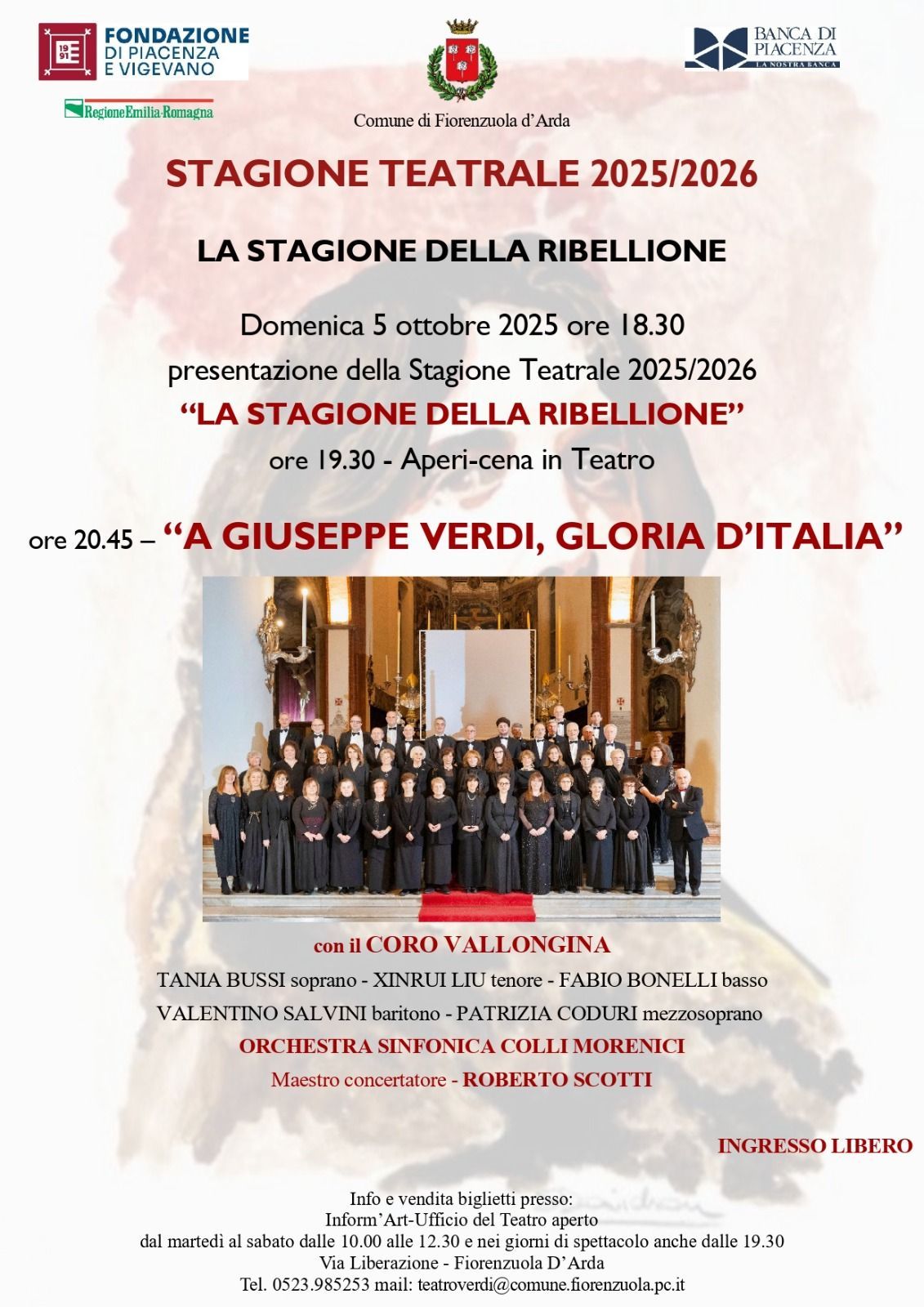 Domenica 5 ottobre, il Teatro Verdi di Fiorenzuola dà il via alla stagione teatrale 2025-2026 con il concerto “A Giuseppe Verdi, Gloria d’Italia”.