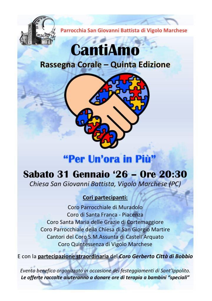 In occasione dei festeggiamenti del Compatrono Sant'Ippolito, sabato 31 gennaio 2026, alle ore 20.30, la Parrocchia di Vigolo Marchese organizza la quinta edizione della Rassegna Corale "CantiAmo”.