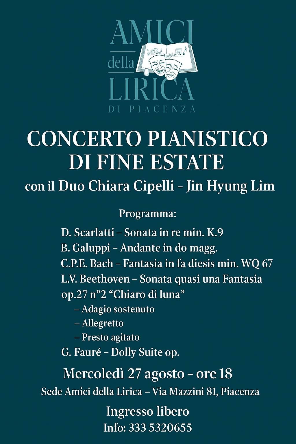 Mercoledì 27 agosto alle ore 18.00, presso la Sede degli Amici della Lirica, in via Mazzini 81 a Piacenza, riparte la Stagione del Melodramma dopo la pausa estiva con il Concerto Pianistico di Fine Estate.
