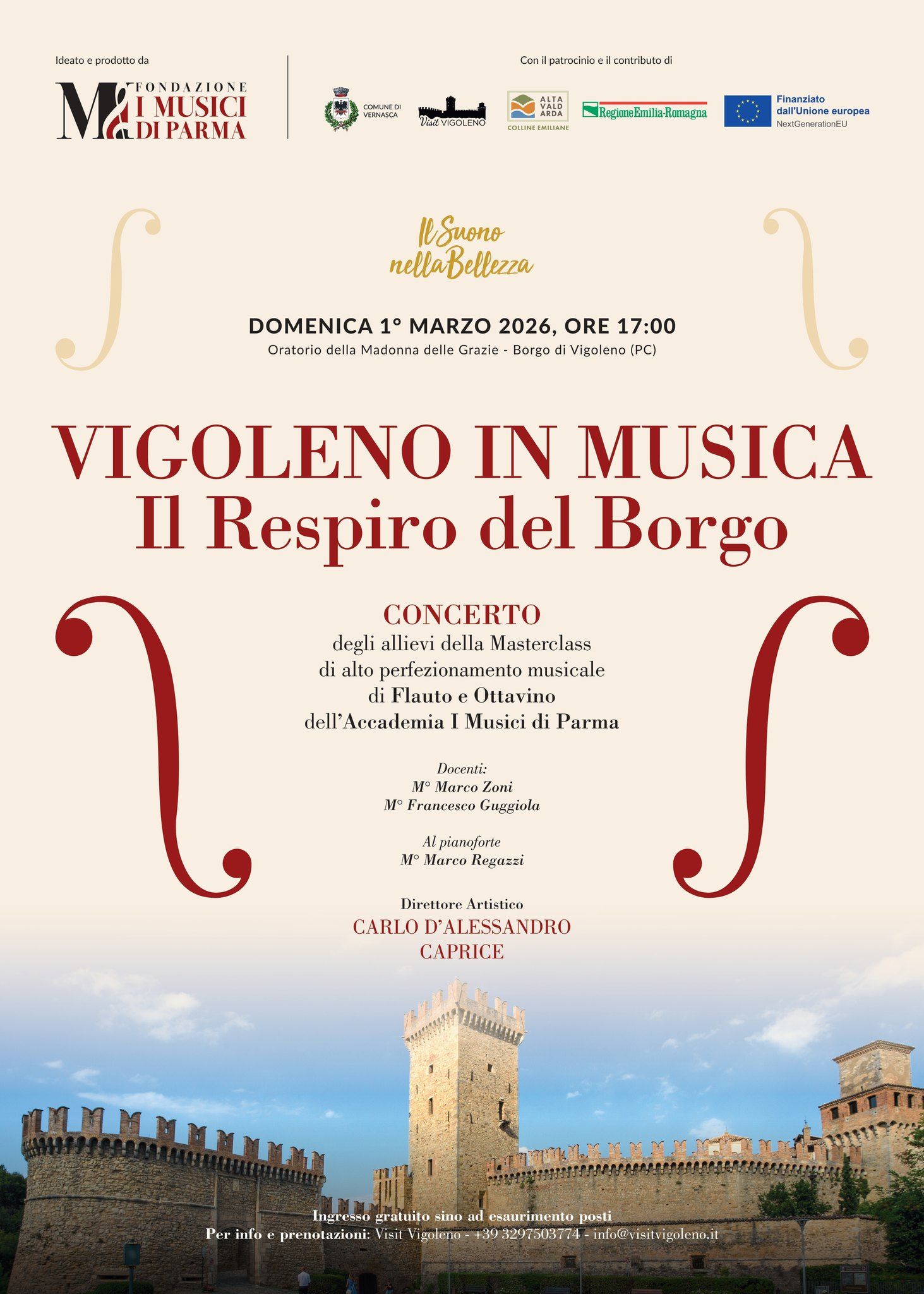 L’appuntamento conclude tre giorni di ritiro, studio e prove che, dal 27 febbraio al 1 marzo, vedono i giovani talenti dell’Accademia protagonisti del progetto di alta formazione "Vigoleno in Musica – Il Respiro del Borgo", inserito nel percorso “Il Suono nella Bellezza”.