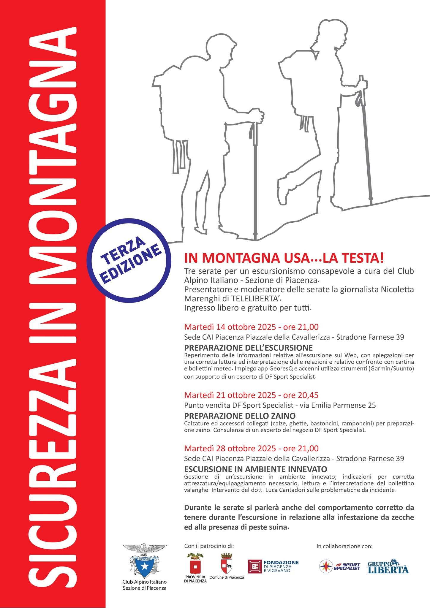 Martedì 28 ottobre, alle ore 21.00, si conclude la terza edizione della rassegna In montagna usa… la testa, organizzata dal Club Alpino Italiano, Sezione di Piacenza, con un appuntamento dedicato alla sicurezza sulle escursioni in ambiente innevato.