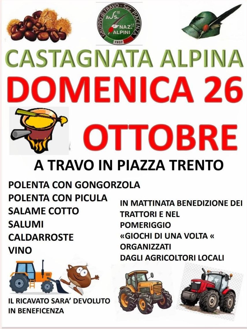 Domenica 26 ottobre, con l’arrivo dell’autunno, Travo ospiterà la tradizionale Castagnata Alpina, organizzata dal Gruppo Alpini di Travo.