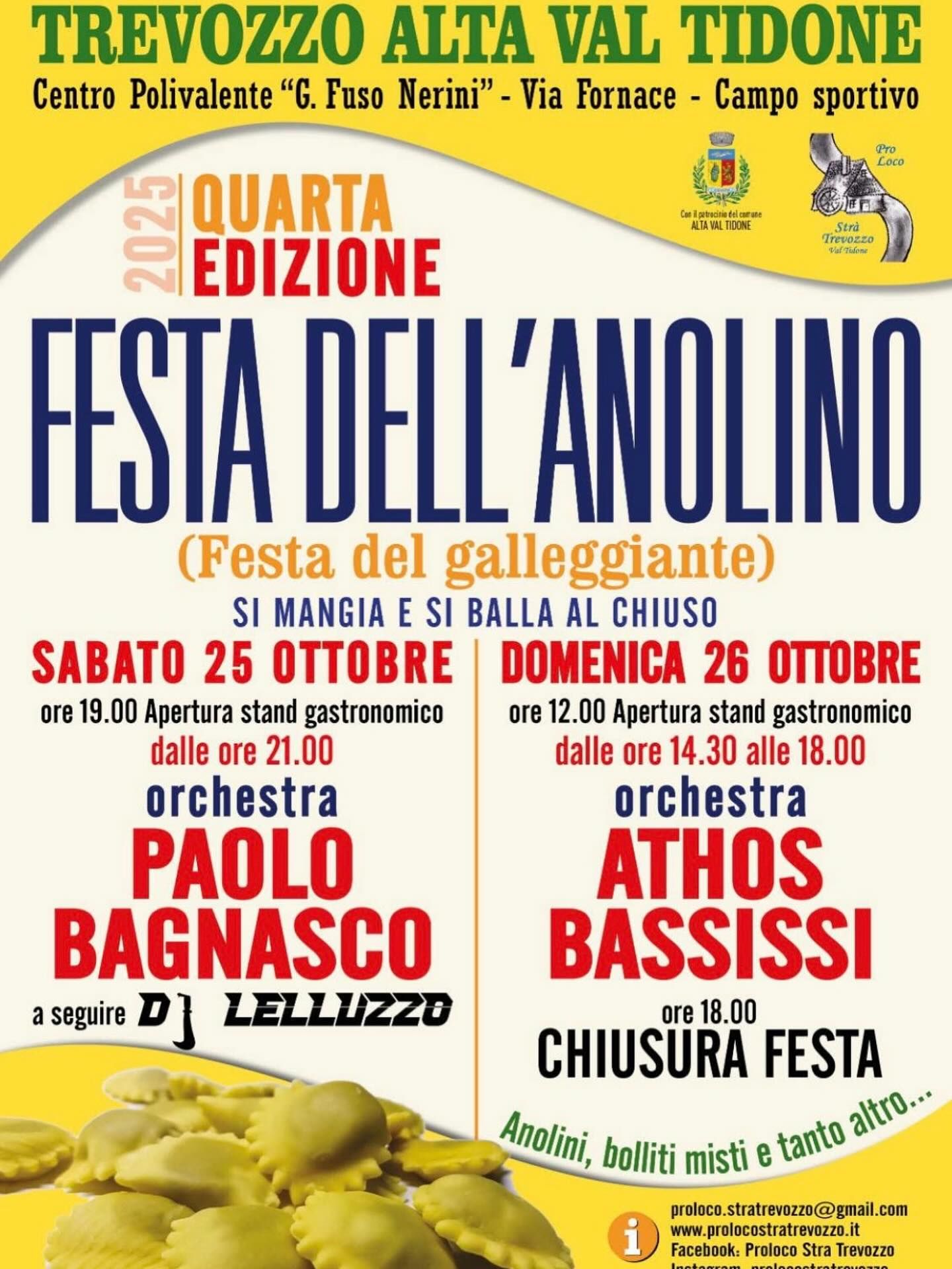Torna a Trevozzo, sabato 25 e domenica 26 ottobre, la quarta edizione della Festa dell’Anolino, dedicata alla celebre pasta fresca ripiena, simbolo della tradizione gastronomica locale.