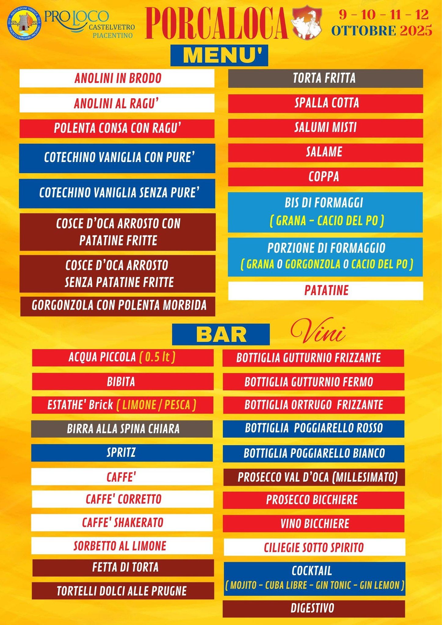 Il menù propone i grandi classici: anolini in brodo e al ragù, cosce d’oca, cotechino vaniglia, torta fritta e altre proposte, preparate con cura dalla Pro Loco e servite al coperto, con possibilità di servizio al tavolo e d’asporto.