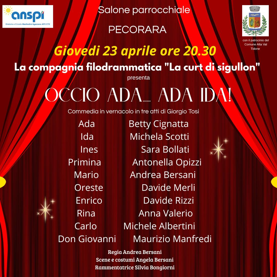 Giovedì 23 aprile alle ore 20.30, presso il salone parrocchiale di Pecorara, va in scena "Occio Ada.. Ada Ida!", commedia dialettale in tre atti di Giorgio Tosi, proposta dalla Compagnia dialettale La curt di sigullon e diretta da AndreaBersani.