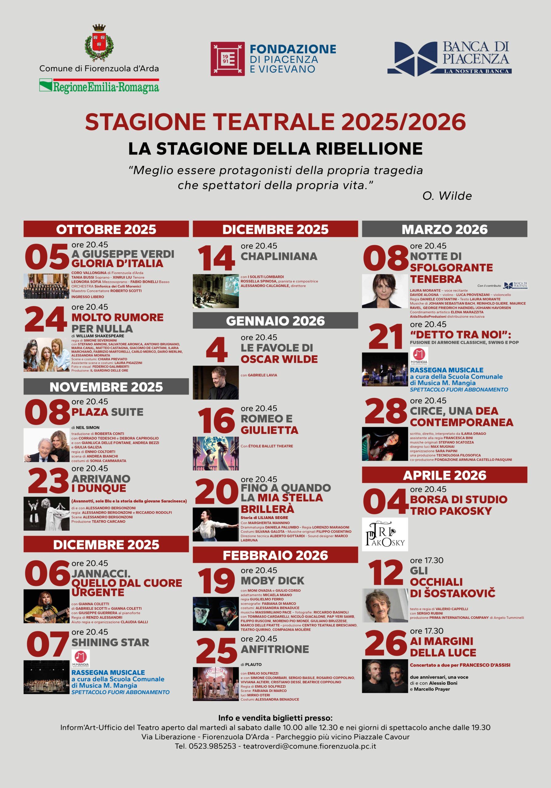 Il Teatro Giuseppe Verdi di Fiorenzuola d’Arda si prepara ad aprire le sue porte a un nuovo viaggio nel mondo delle emozioni con la Stagione Teatrale 2025/2026, dal titolo suggestivo “La Stagione della Ribellione”, un omaggio a Oscar Wilde, il geniale drammaturgo e poeta inglese che con la sua arte ha saputo sfidare pregiudizi e le convenzioni della società.