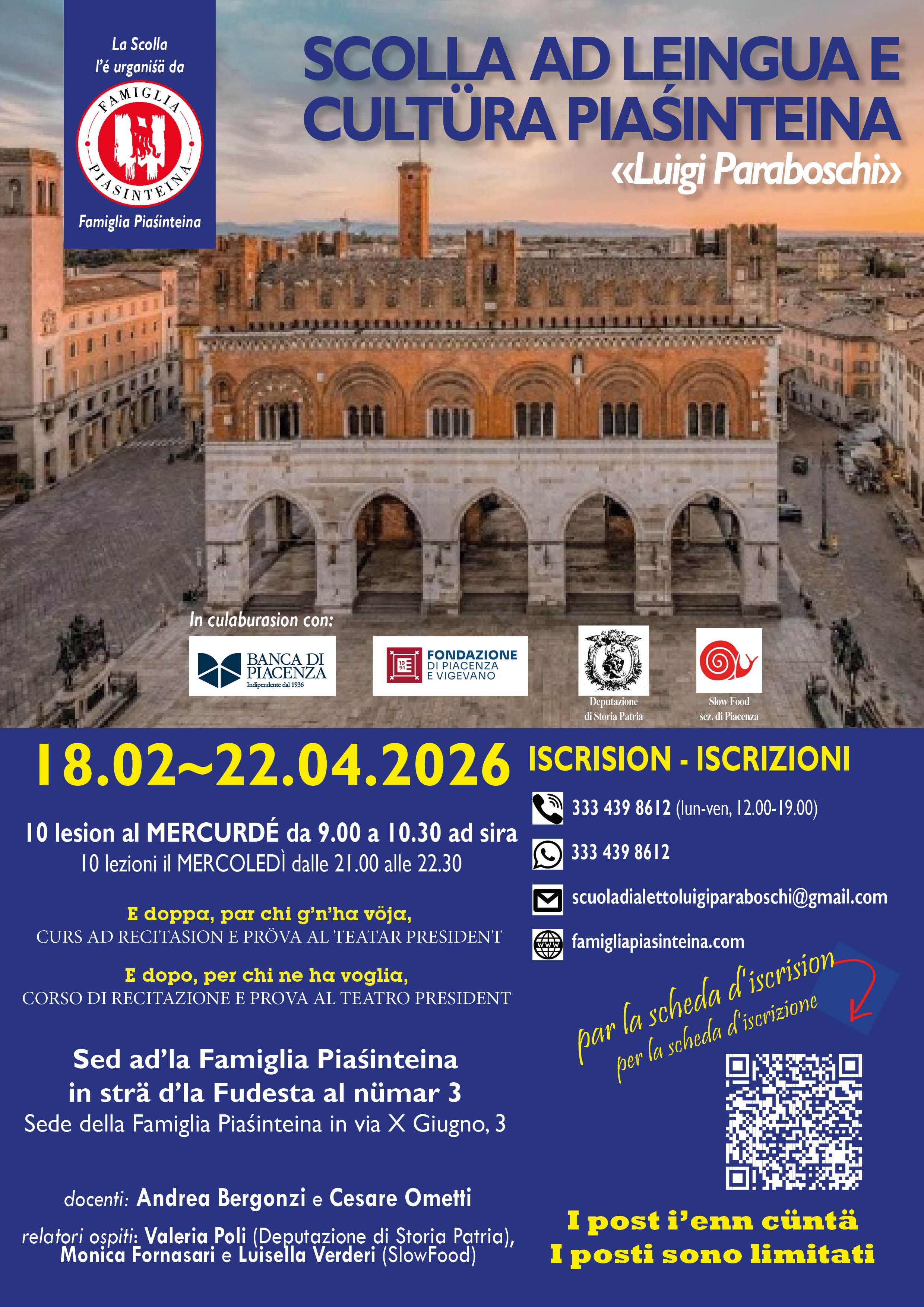 Le lezioni affronteranno grammatica, dizione, scrittura e cultura piacentina, offrendo strumenti concreti per imparare a leggere, scrivere e recitare nel vernacolo locale. Docenti saranno Andrea Bergonzi e Cesare Ometti, già apprezzati nelle precedenti edizioni e allievi del compianto Luigi Paraboschi, storico insegnante della scuola che oggi porta il suo nome.