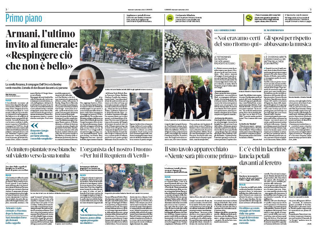In sedicimila - un oceano - gli hanno voluto dire addio alla camera mortuaria a Milano, tra le lanterne, il buio, l’eleganza di un lutto diventato mondiale. Sì, c’era il mondo, in fila, per 18 ore tra sabato e domenica in via Bergognone. Ma l’abbraccio a chi soffre più di tutti per l’uomo e non per il dio della moda - la sorella Rosanna che con lui aveva condiviso lo sfollamento in guerra in Valtrebbia, il compagno Leo Dell’Orco che gli era vicino da decenni, i nipoti, quei collaboratori fedelissimi arrivati in pullmino, tutti vestiti di nero, tutti così “armaniani” in giacca e pantalone scuro - è stato possibile solo tra 62 persone, gli invitati al funerale sobrio, intimo e letteralmente blindato di Giorgio Armani, ieri a Rivalta.