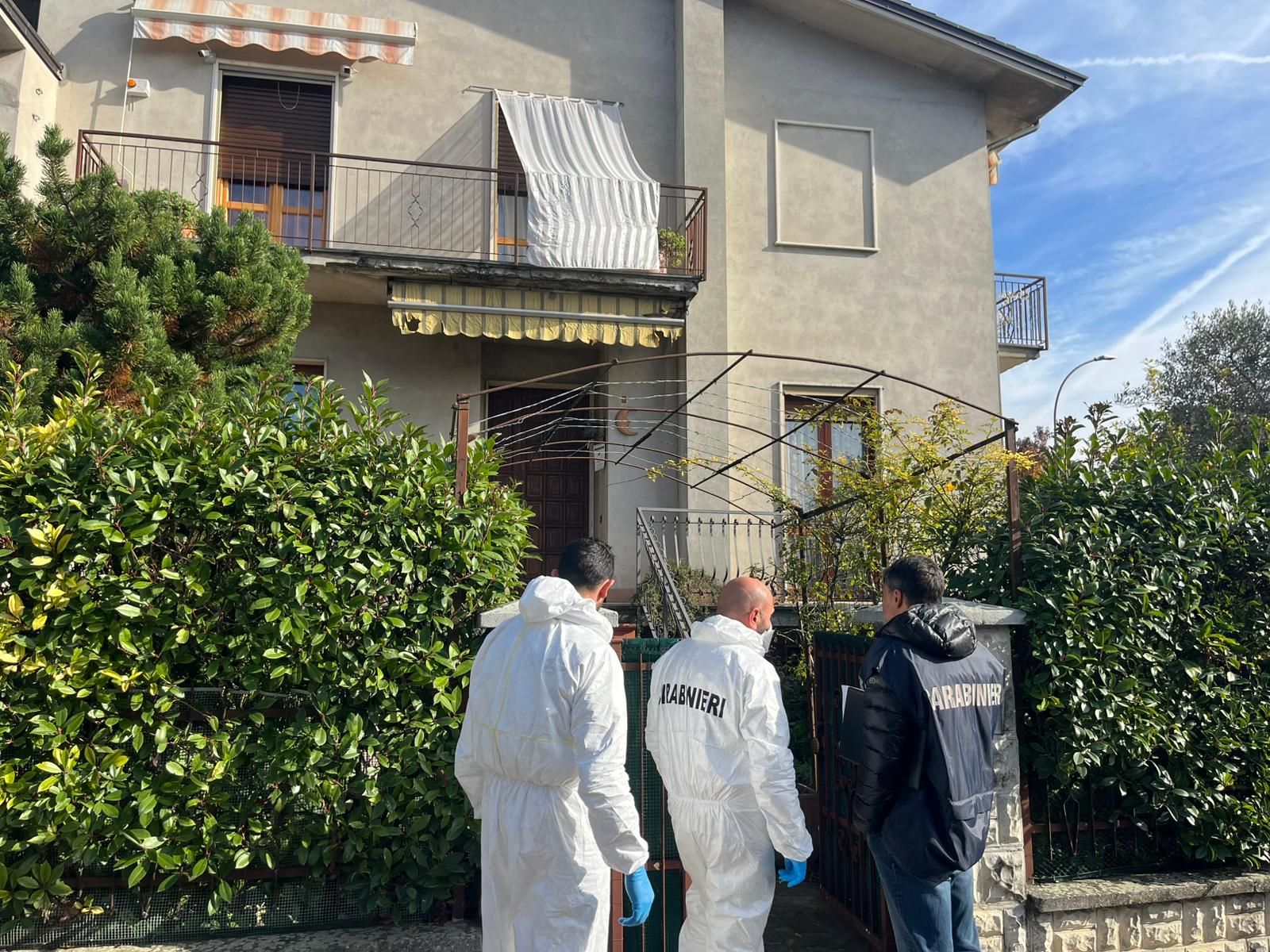 I carabinieri del Nucleo investigativo di Piacenza davanti all'abitazione di Castel San Giovanni dov'è stato trovato il corpo senza vita di un 85enne- © Libertà/Marco Vincenti