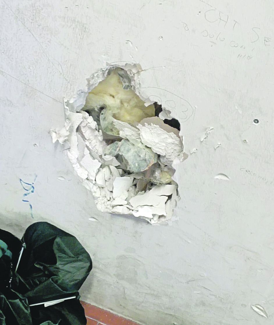 Lezioni in corridoio. Nel corso della mattinata è anche “esplosa” la sezione di una parete dove si è aperto un buco. La Provincia: stiamo provvedendo