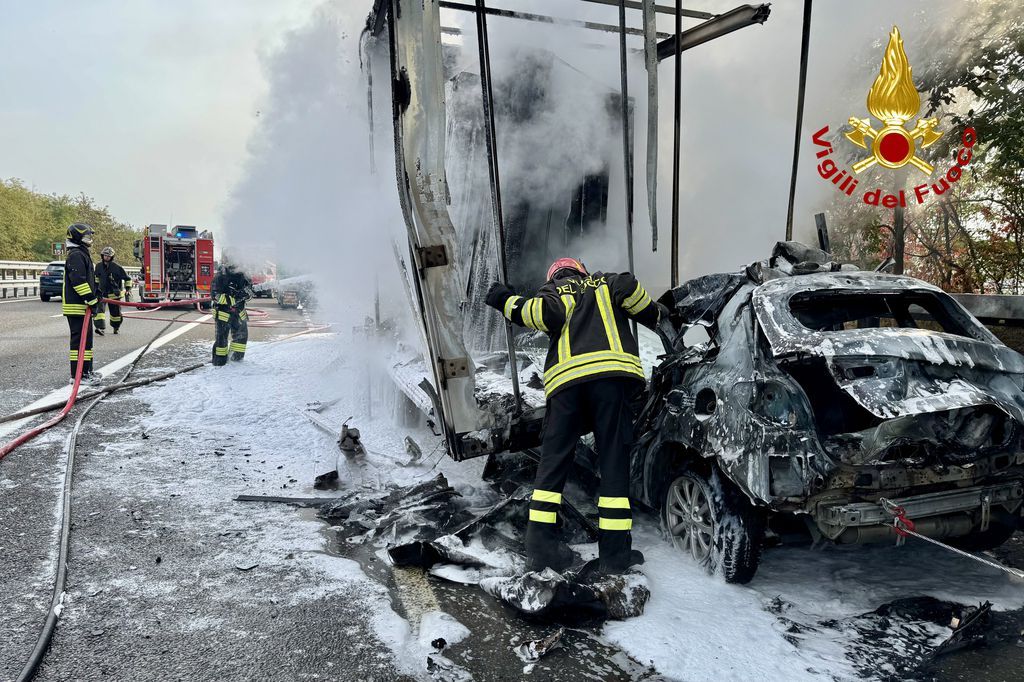 Gravissimo incidente stradale in A21 tra il casello di Piacenza Ovest e quello di Piacenza Sud. In seguito ad un scontro tra un'auto e un Tir hanno preso fuoco il semirimorchio e la vettura. Morti nel rogo i due occupanti dell'auto, illeso ma sotto shock l'autista del mezzo pesante.