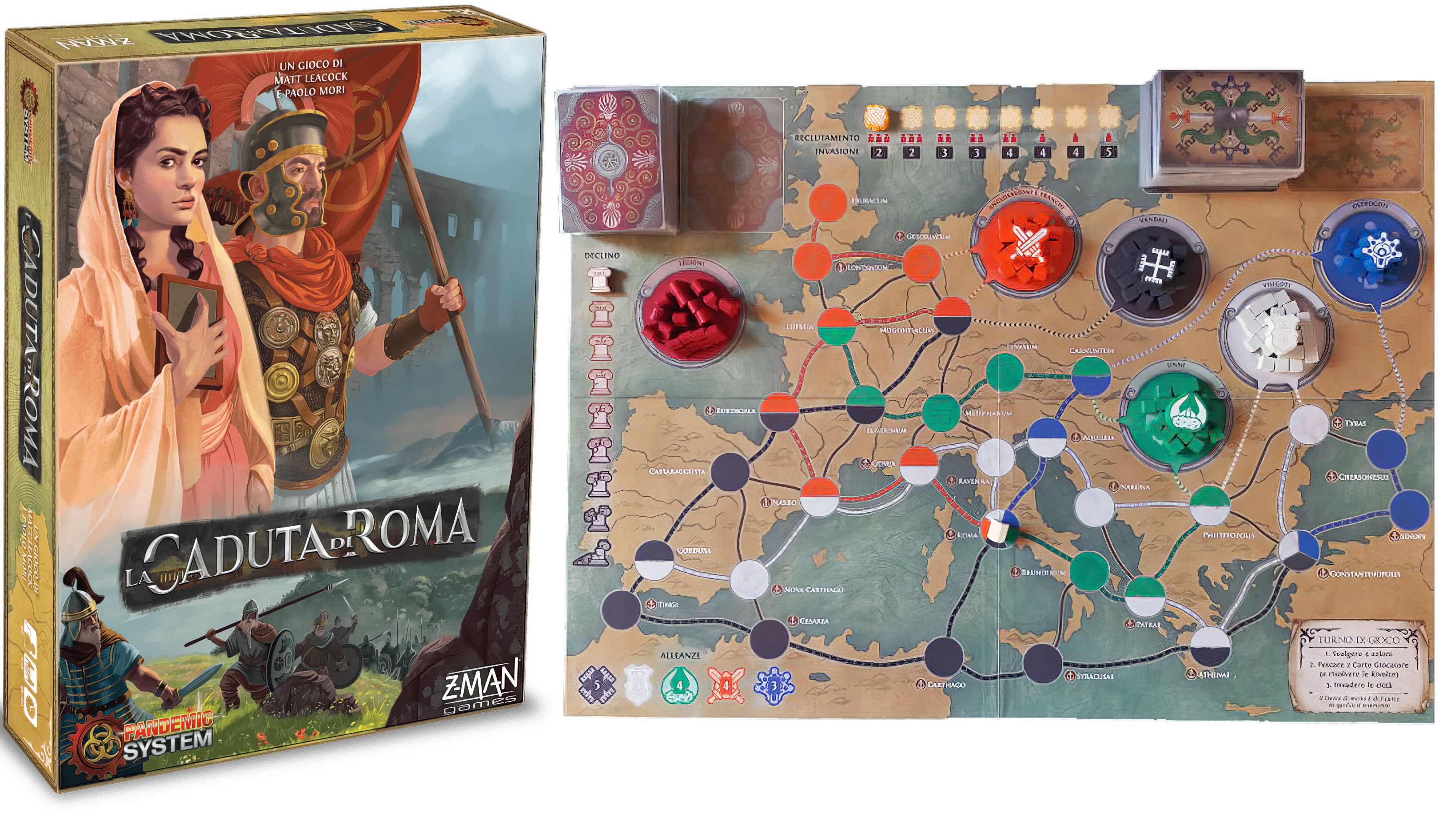 Nel 2018 vide la luce La Caduta di Roma, che per la prima metteva i giocatori contro nemici concreti: le orde barbariche che minacciavano l’Impero romano. Progettato dal game designer italiano Paolo Mori, fu il primo titolo a riportare in copertina la dicitura Pandemic System, segnando il momento in cui la meccanica creata da Leacock si liberò dal legame esclusivo con le emergenze sanitarie o i disastri naturali.