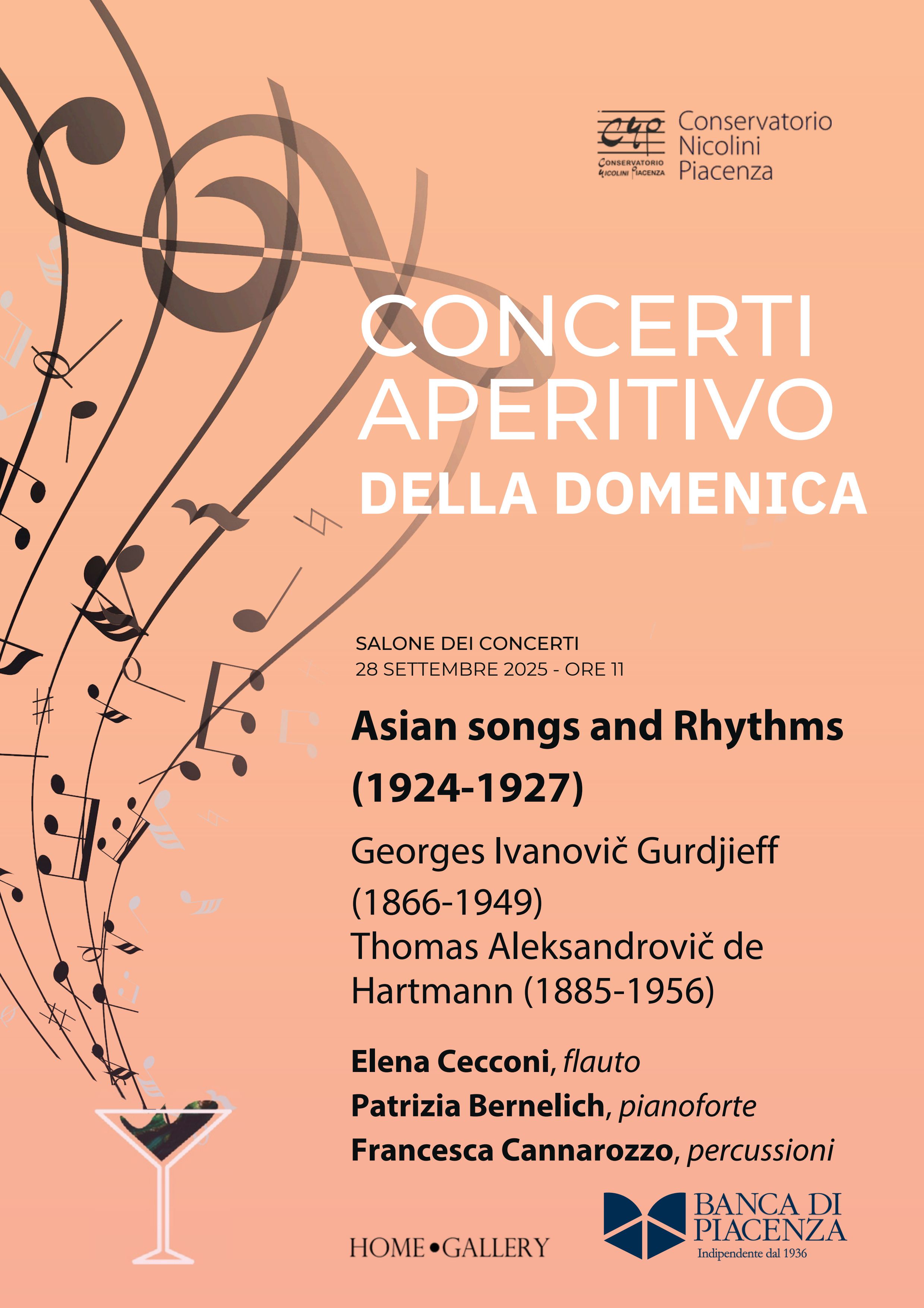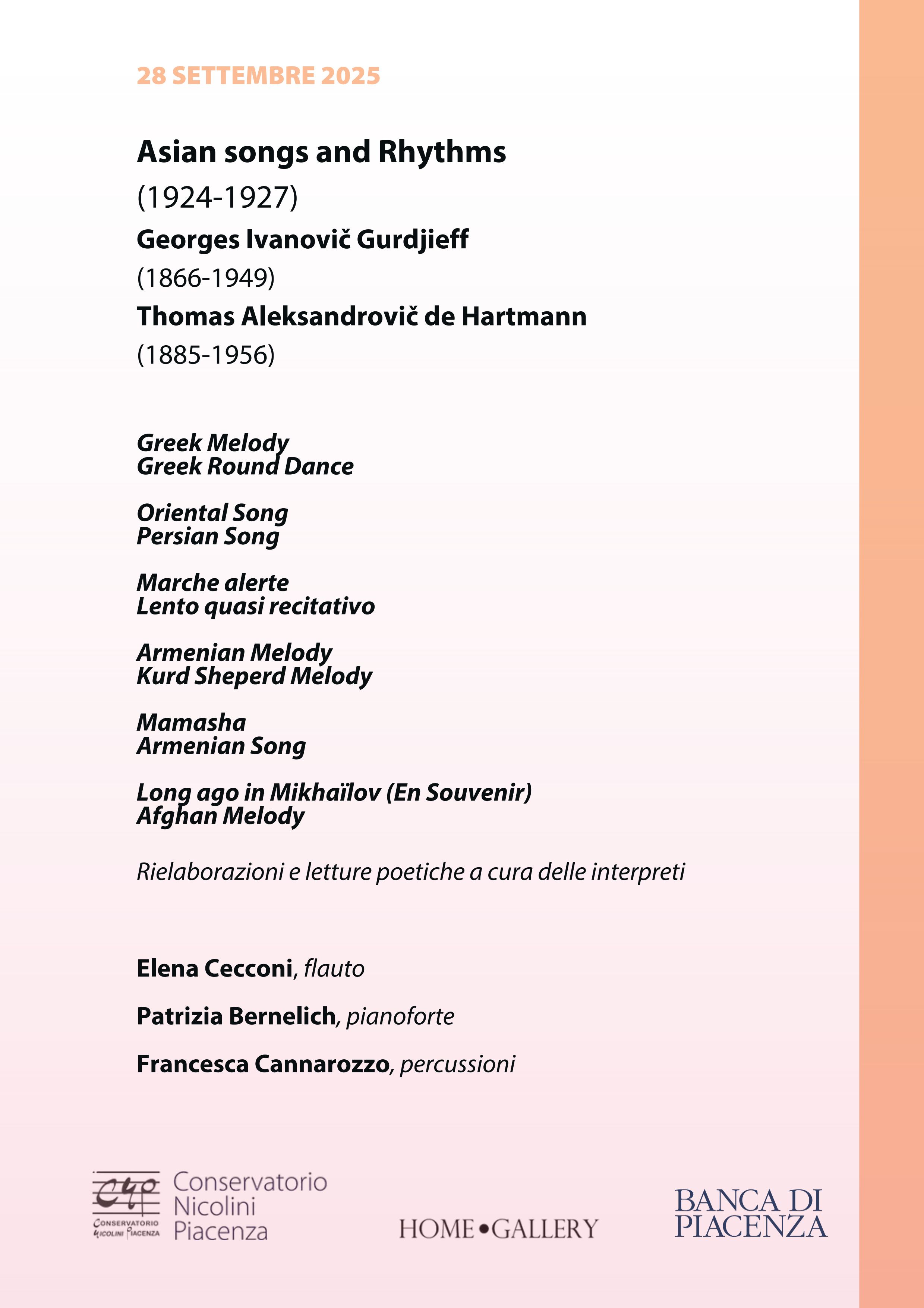 Prosegue al Conservatorio Nicolini la rassegna Concerti Aperitivo della Domenica. Il prossimo appuntamento, in programma il 28 settembre 2025 alle ore 11.00 nel Salone dei Concerti, è intitolato Asian Songs and Rhythms (1924-1927), musiche di Georges Ivanovič Gurdjieff (1866-1949) e Thomas Aleksandrovič de Hartmann (1885-1956).