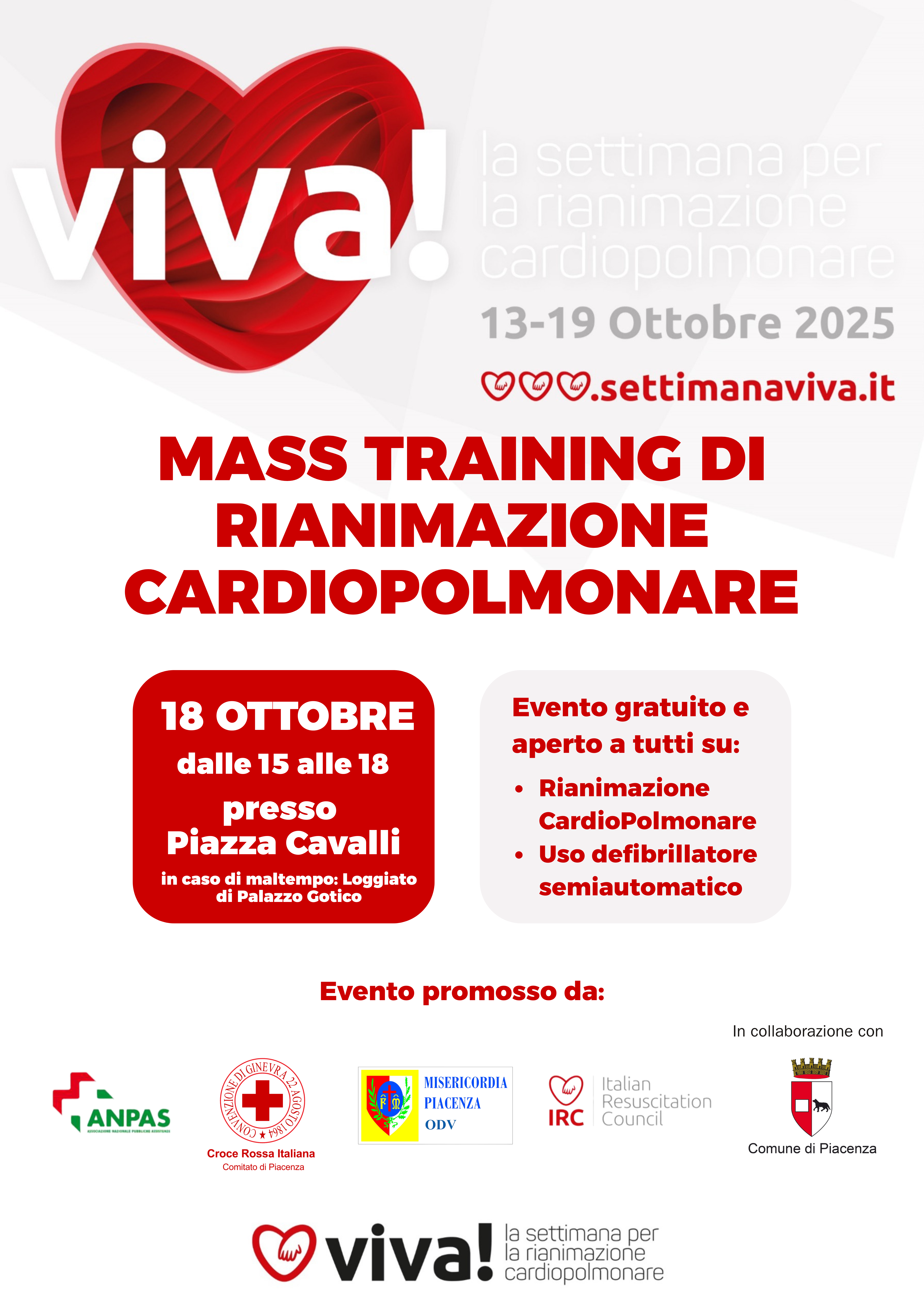 Sabato 18 ottobre, dalle 15 alle 18, Piazza Cavalli si trasformerà in una grande aula a cielo aperto dove tutti potranno imparare le tecniche base per poter salvare una vita. In occasione di VIVA – la Settimana per la Rianimazione Cardiopolmonare, Croce Rossa Italiana – Comitato di Piacenza, in collaborazione con Anpas, Misericordia e IRC (Italian Resuscitation Council), organizza un mass training gratuito e aperto a tutti dedicato alla rianimazione cardiopolmonare (RCP) e all’uso del defibrillatore semiautomatico (DAE).