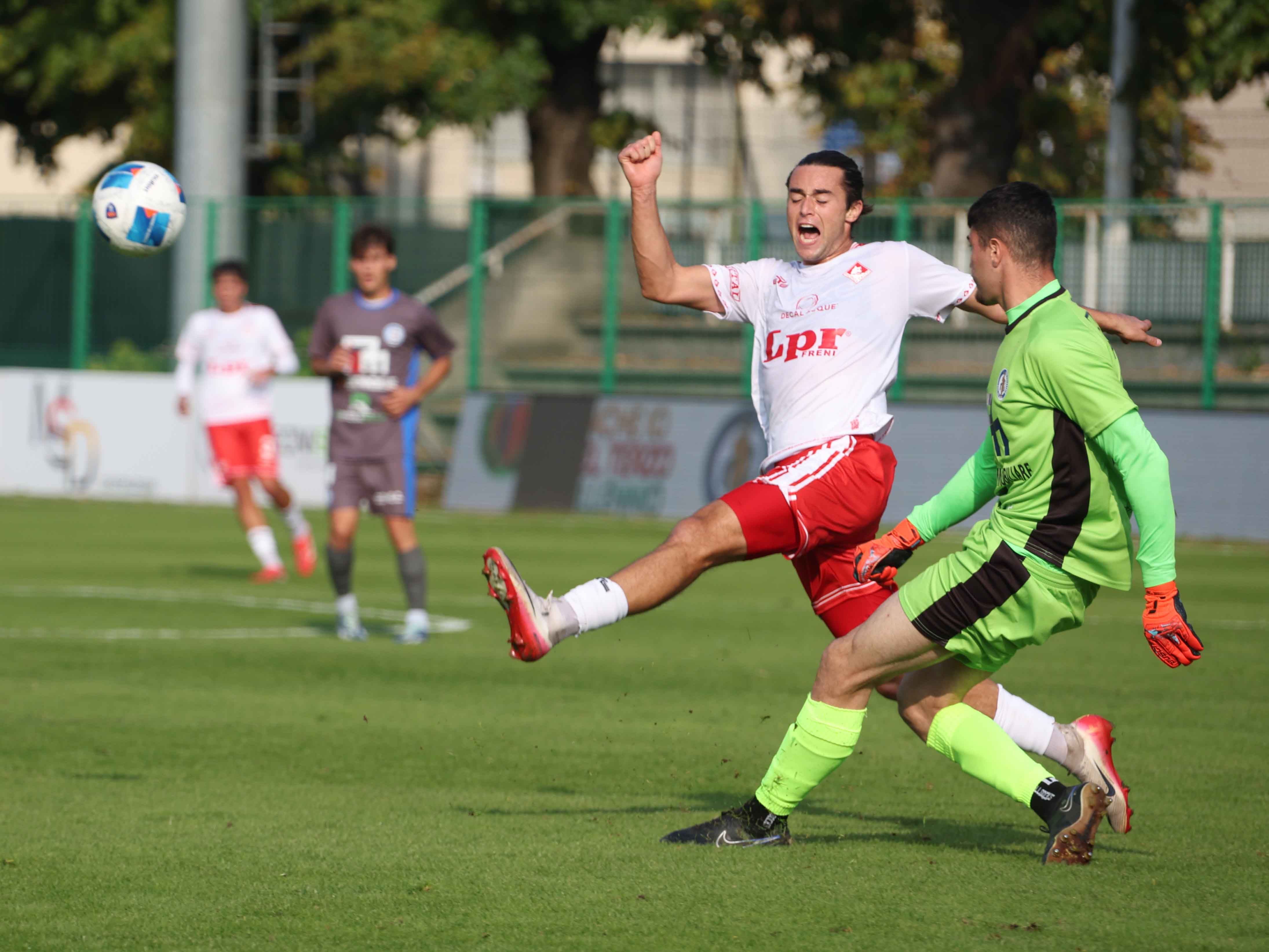 Locali che pressano subito alto e provano a sorprendere la retroguardia biancorossa con rapidi cambi di fronte, la prima emozione arriva al 6', con la rovesciata di Minessi centrale.