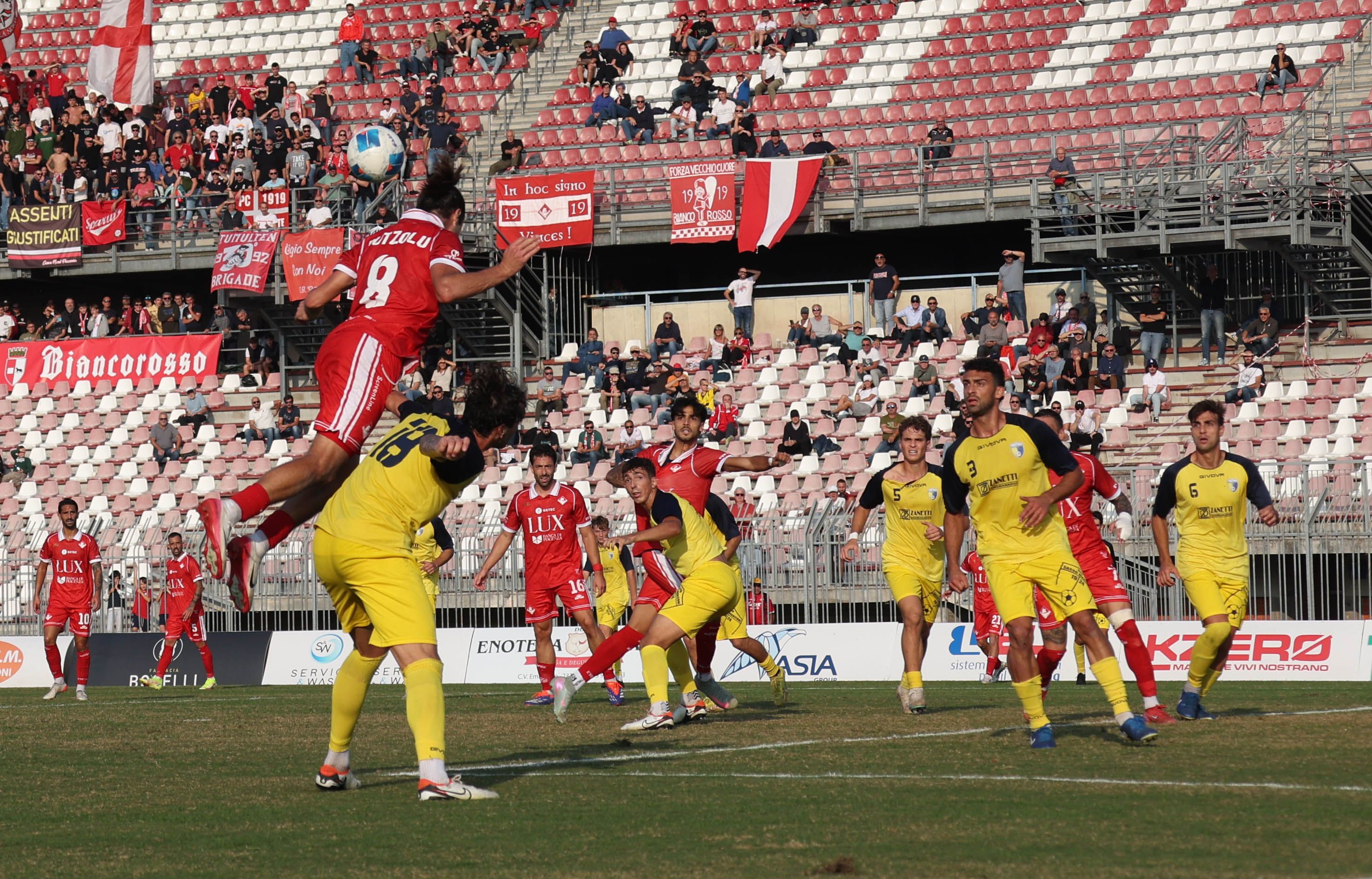 I biancorossi partono forte e in avvio chiudono i bolognesi nei propri 20 metri, conquistando 4 corner e tirando due volte in modo pericoloso con Poledri. Gli ospiti però passano alla prima occasione dopo 10’: sul contropiede gialloblù, Merighi raccoglie l’apertura di Pirazzoli e buca in diagonale un Ribero non esente da responsabilità. Lo svantaggio spegne il Piace, che fatica a reagire e a creare occasioni degne di nota. Ci prova Putzolu, in ripartenza e poi con una girata aerea, e poi Mustacchio che spara un destro potente parato in angolo di piede da Celeste.