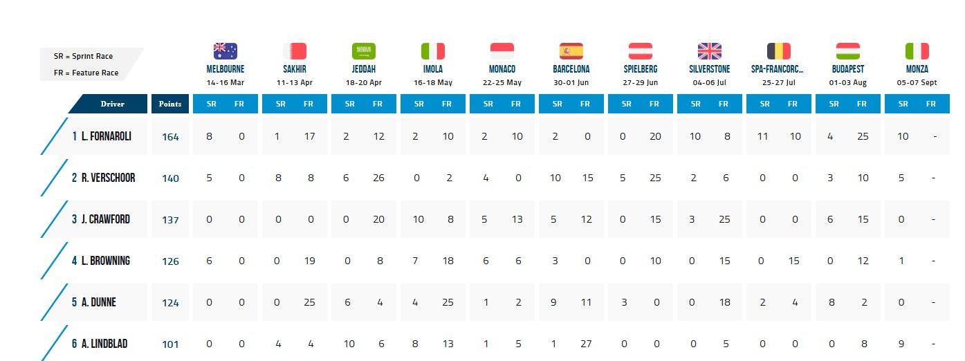 Dopo la partenza, alla quarta curva il piacentino è salito al secondo posto a scapito di Meguetounif, per poi passare in testa all'ottavo giro. Il rivale più agguerrito è Arvid Lindblad, che arriva al Drs con Fornaroli, ma non riesce a completare l'opera. È Leo a trionfare davanti al pubblico di casa e a diventare sempre più leader della Formula 2: già in testa della classifica piloti, consolida il primo posto. Domani partirà in ottava posizione nella Feature Race (partenza alle 9.45).
