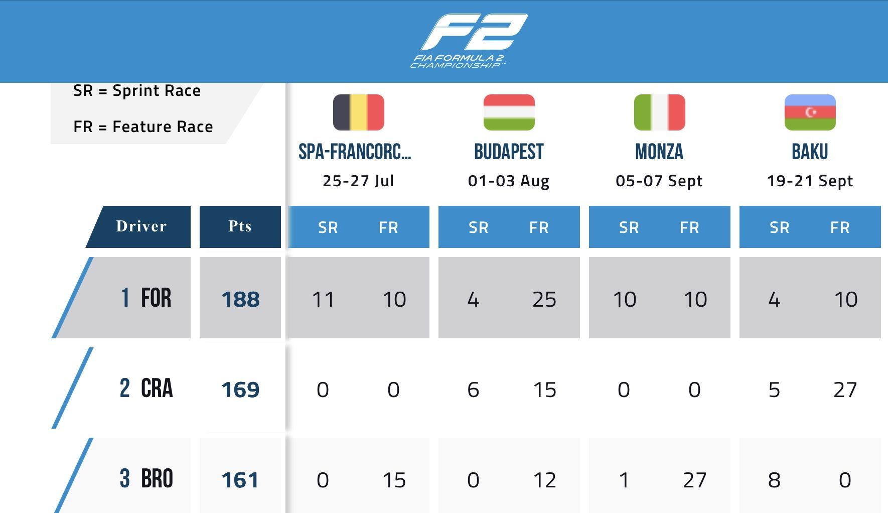 Un quinto posto prezioso, con la capacità di rimediare a un errore senza il quale probabilmente sarebbe arrivato il podio. Il week end di Formula 2 a Baku si chiude con un piazzamento per Leonardo Fornaroli, in top five nella Feature Race di stamattina. L'episodio chiave è arrivato al diciassettesimo giro, dove in curva 1 il piacentino dell'Invicta Racing ha tamponato Alexander Dunne, ricevendo 10 secondi di penalizzazione. Nonostante la brutta notizia, Leo ha continuato a guidare forte, portandosi anche al terzo posto teorico (se non ci fosse stata la penalizzazione). La vittoria è andata a Jak Crawford, che ha capitalizzato la pole position precedendo in un bel duello Joshua Durksen, mentre terzo è Dino Beganovic. Per Fornaroli, il quinto posto frutta 10 punti preziosi che gli permettono di continuare a stare in vetta a quota 188, a + 19 sul lanciato Crawford (169), che a sua volta ha scavalcato in primis Luke Browning, ora terzo a quota 161. Il tutto a due Gran Premi dal termine della stagione.