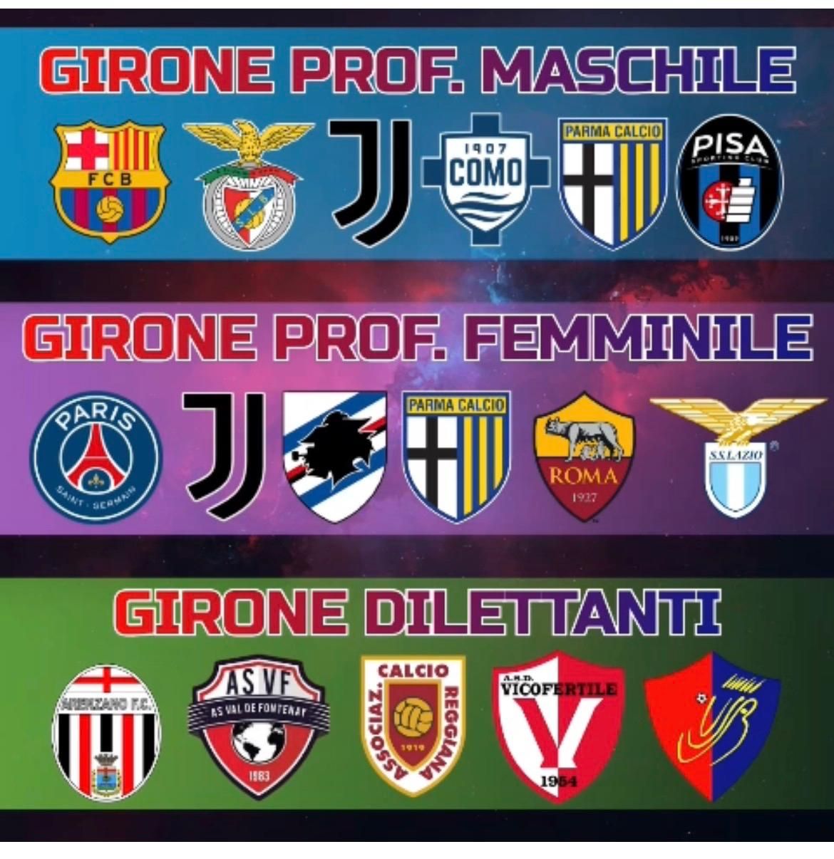 Il girone maschile riservato alle squadre professionistiche vedrà in campo i Pulcini classe 2016 di Barcellona, Juventus, Benfica, Como, Pisa e Parma.