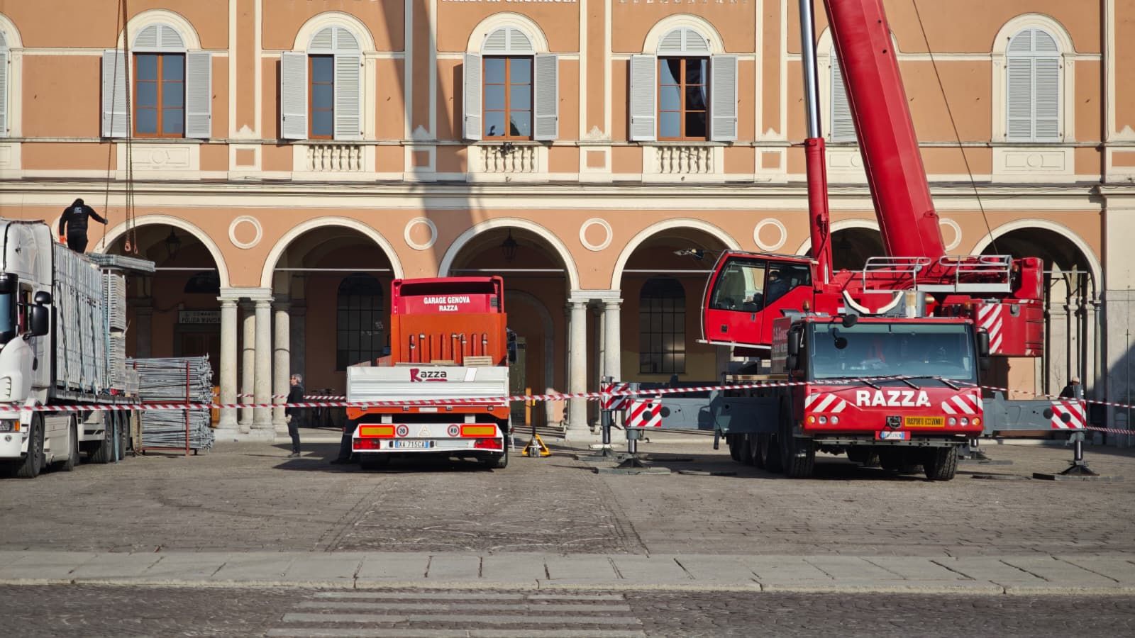 In realtà la gigantesca attrezzatura è servita a sollevare la selva di impalcature che fino a qualche tempo fa era montata nel cortile interno del palazzo. Finiti i lavori di tinteggiatura delle mura che circoscrivono i cortile interno si è reso necessario liberarlo dalle impalcature. Queste ultime sono prima state smontate e impilate, dopodiché il braccio meccanico le ha sollevate (il cortile non ha tetto) facendole passare dall'alto.