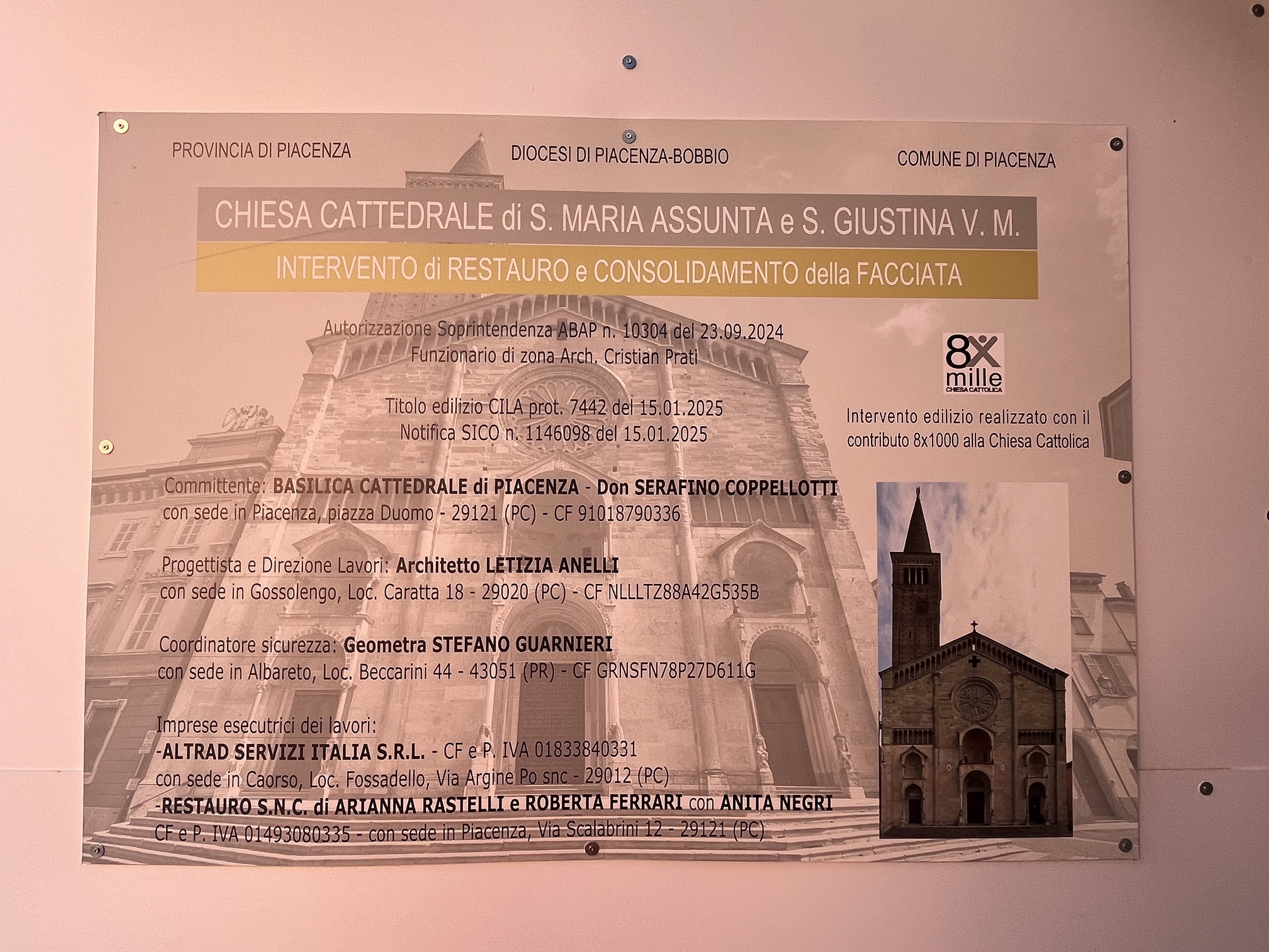 C'è da attendere ancora fino a novembre per "scartare” la facciata del Duomo. La conclusione dei lavori è prevista da cronoprogramma per il 30 ottobre: «Poi occorrerà smontare le impalcature – spiega il direttore dell'Ufficio dei beni culturali della Diocesi di Piacenza-Bobbio Manuel Ferrari – ma entro la fine dell'anno sicuramente la facciata della cattedrale sarà pronta». L'intervento si è reso necessario per alcune importanti criticità evidenziate con la caduta di materiale lapideo che si era staccato il 6 gennaio dello scoro anno in corrispondenza del quadrante superiore destro: la caduta di materiale aveva costretto alla limitazione del transito sul sagrato e al totale impedimento del passaggio dal portone sud.