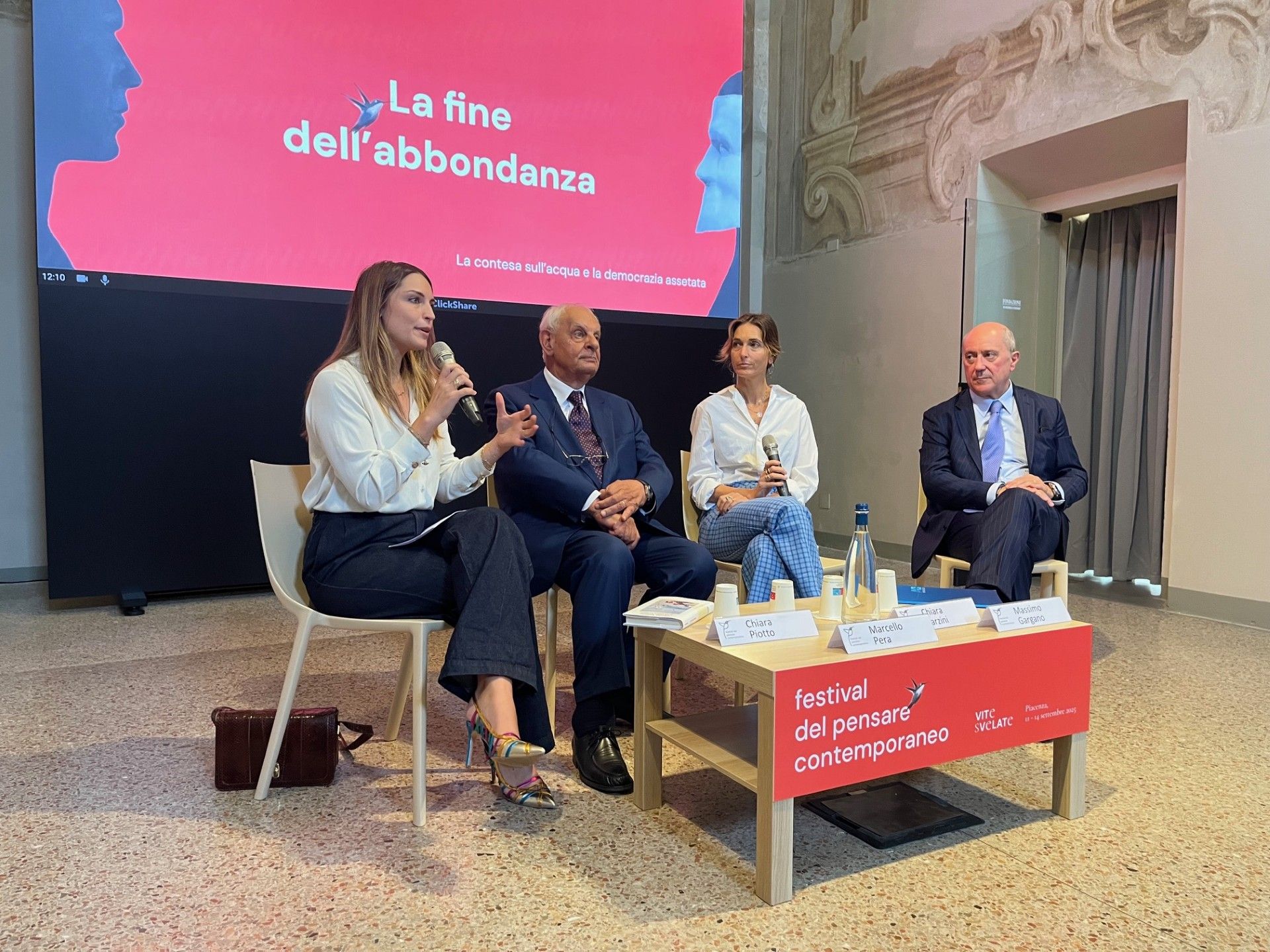 No, non si esagera a utilizzare il termine emergenza quando si parla di acqua. Ne sono convinti i relatori che hanno partecipato all'incontro intitolato «La fine dell’abbondanza. La contesa sull’acqua e la democrazia assetata» organizzato all'interno del programma del Festival del Pensare contemporaneo nell'auditorium della Fondazione di piacenza e Vigevano. A confrontarsi, dopo il saluto iniziale del ministro per gli Affari europei Tommaso Foti, il senatore Marcello Pera, il direttore generale dell'associazione nazionale dei consorzi di gestione e tutela del territorio e delle acque irrigue (Anbi) Massimo Gargano e la scrittrice Chiara Barzini.
