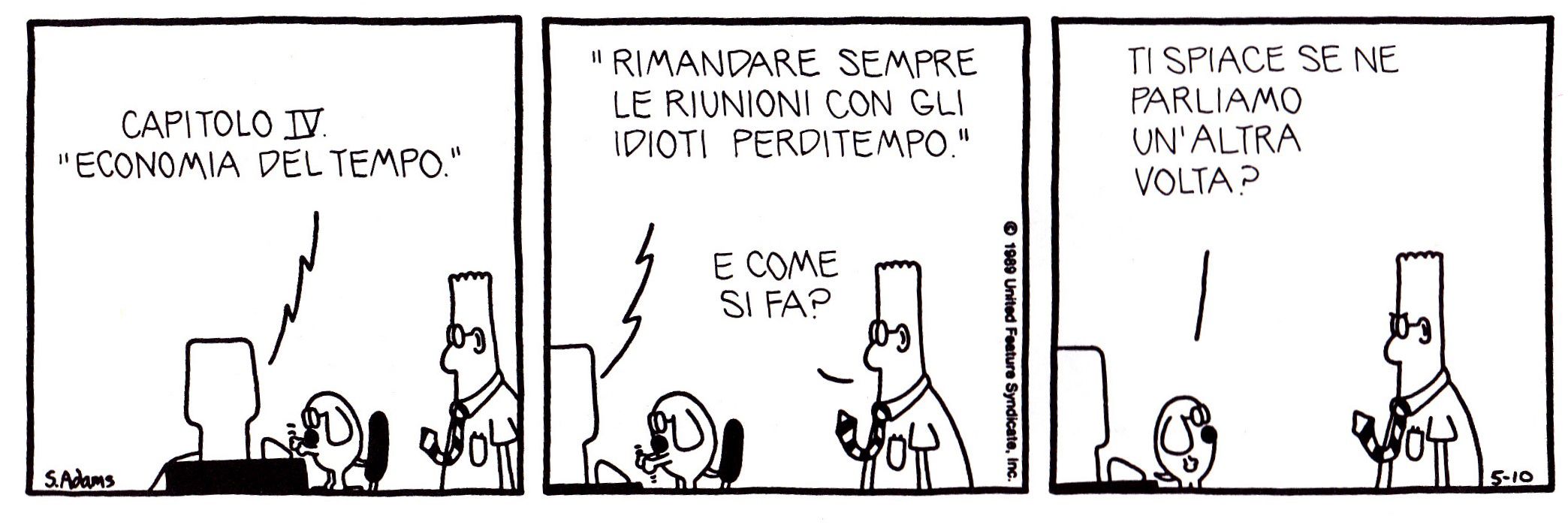 Tutto cambia perché non cambi niente, tanto per citare Tomasi di Lampedusa, e il fumetto lavorativo resta scoraggiante, però lo scenario si evolve ancora. Non di tanto ed essenzialmente per quanto riguarda le nuove competenze tecniche, che nel 1989 vedono arrivare “Dilbert” del newyorkese Scott Adams, fumettista laureato in economia e con un background nel campo delle telecomunicazioni. Dilbert è un ingegnere informatico in una società del settore, competente quanto frustrato dalle prassi aziendali, che sprecano fondi per produrre inefficienza, e per di più angariato da un manager senza nome dai capelli a punta, privo della minima preparazione quanto abile nel giustificarsi con formule di gergo dirigenziale senza significato. Una situazione disperante in cui Adams porta il pubblico a riconoscersi, offrendo in cambio una via d’uscita nei personaggi secondari ma non troppo della striscia. A cominciare da Dogbert, il cane di Dilbert, più intelligente del suo padrone, nonché pragmatico e spregiudicato. Mentre Dilbert, pesce fuor d’acqua nerd e tecnologico, è un perdente, il ben integrato Dogbert scrive manuali, incassa dollari a palate come consulente aziendale in materie inconsistenti (ma alla moda) ed è un vincente come il gatto Catbert, impudente e crudele direttore delle risorse umane, che come gratifica offre agli impiegati l’opportunità di grattargli il pancino. Evidentemente non solo gli informatici proprietari di cani si sono specchiati in Dilbert, visto che la strip è stata pubblicata su più di un migliaio di testate in 65 nazioni, ne sono state tratte due stagioni d’una serie d’animazione e ha lanciato il “principio di Dilbert”, secondo il quale le aziende tendono a promuovere i dipendenti meno competenti in posizioni direttive, per limitare i danni che causerebbero in quelle operative.