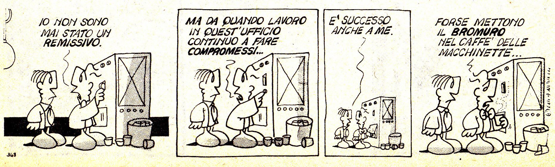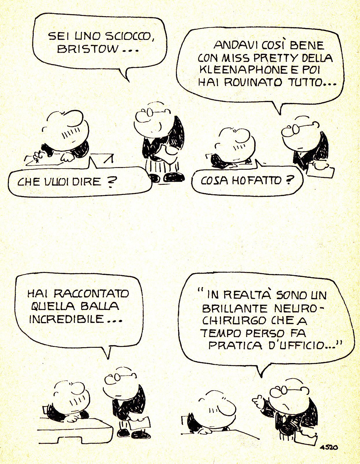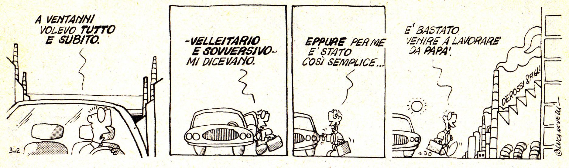 Pochi anni separano Bristow da “Il Laureato” del milanese Luca Novelli, eppure sono anni in cui il panorama è cambiato, specie quello italiano. Il Laureato, nato nel 1974, non è uno specifico protagonista quanto l’archetipo del neolaureato che cerca di farsi strada in un ambiente dominato da favoritismi, opportunismi e figli di papà, contro i quali l’aver studiato non serve un granché. Novelli ne porta avanti le strisce fino agli anni ’80 seguendo le trasformazioni socio-aziendali, così, nella stagione dei paninari e dello yuppismo (ve ne ricordate? Si rifaceva alla definizione di “yuppies” ricavata dall’acronimo americano Y.U.P., ossia “young urban professional”, giovane professionista urbano), anche il Laureato diventa uno yuppie rampante e in carriera. Non ci vuole molto, ci informa Novelli. Basta fare il paninaro per cinque anni e poi un master alla Bocconi.