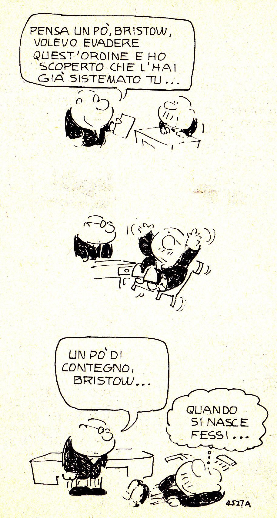 Una delle serie più longeve è “Bristow”, dell’inglese Frank Dickens, pubblicata ininterrottamente dal 1960 al 2012 e chiusa nel 2016 per la dipartita del suo ormai ottantacinquenne creatore. Il Bristow che dà il nome alla striscia e ne è protagonista è un dipendente della mastodontica società Chester-Perry, microcosmo a tenuta stagna i cui giorni sono scanditi da eventi come il compleanno del suo signore e padrone, sir Reginald Chester-Perry, o il terrificante disastro del carrello del tè del ’67, cui tutti si riferiscono con reverente timore e nessuna spiegazione. Chi mai potrebbe non averne sentito parlare? Bristow è il prototipo dell’impiegato di livello rasoterra, pendolare tra i ritardi ferroviari annunciati da altoparlanti che gracchiano annunci incomprensibili e le reprimende del feroce capufficio Fudge, per cui ci aspetteremmo di vederlo annichilito nell’intelletto e nell’animo. Invece in azienda si trova a meraviglia, perché il suo segreto è lavorare il meno possibile. Per far passare le ore coltiva un’inconfessata inclinazione romantica per miss Pretty della Kleenaphone, incaricata d’igienizzare i telefoni sulle scrivanie, e sogna una carriera diversa leggendo “Neurochirurgia per dilettanti” o scrivendo il suo romanzo epocale “Morte vivente nell’ufficio acquisti”. In bombetta, giacca nera e calzoni gessati è assolutamente britannico, tuttavia in lui si sono immedesimati lettori di tutte le nazioni… fuorché degli Stati Uniti, poiché Dickens ha sempre rifiutato di americanizzare il personaggio per distribuirlo oltreoceano. La chiave di tanta popolarità è una filosofia dalla quale s’impara che se la realtà è costrittiva, monotona e soffocante, basta ignorarla.