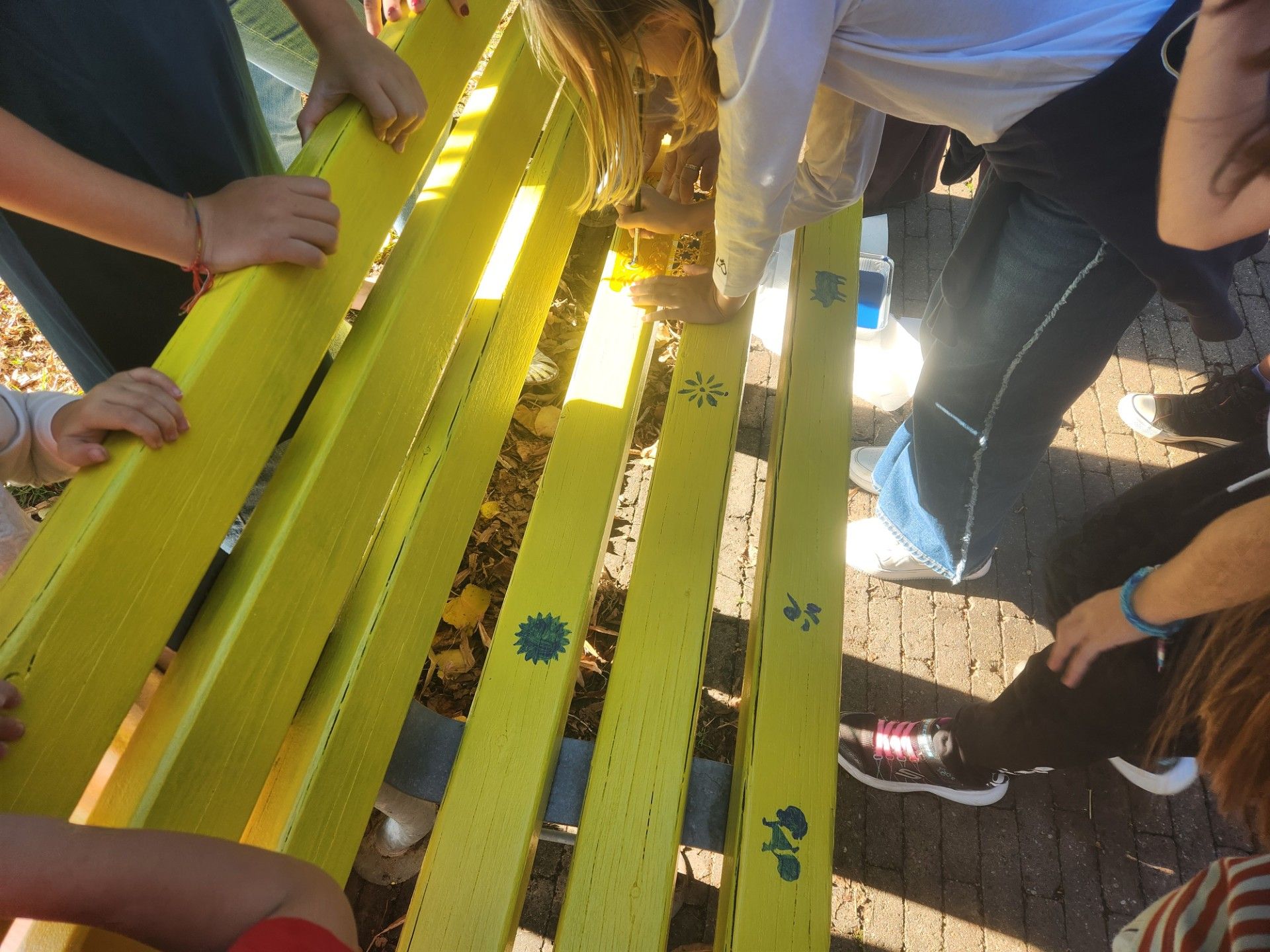 Durante l'evento, i bambini e le bambine hanno potuto partecipare attivamente, decorando la panchina blu con le impronte delle loro mani e contribuendo alla decorazione della panchina gialla con simboli e disegni.