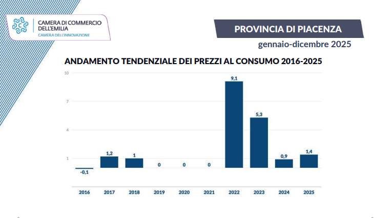 E’ stata dell’1,4%, nel 2025, la variazione media registrata a Piacenza dall’indice dei prezzi al consumo ISTAT per l’intera collettività (NIC); una crescita più evidente rispetto a quella del 2024 (+0,9%), ma comunque in linea con il dato regionale e leggermente inferiore a quello nazionale (+1,5%).