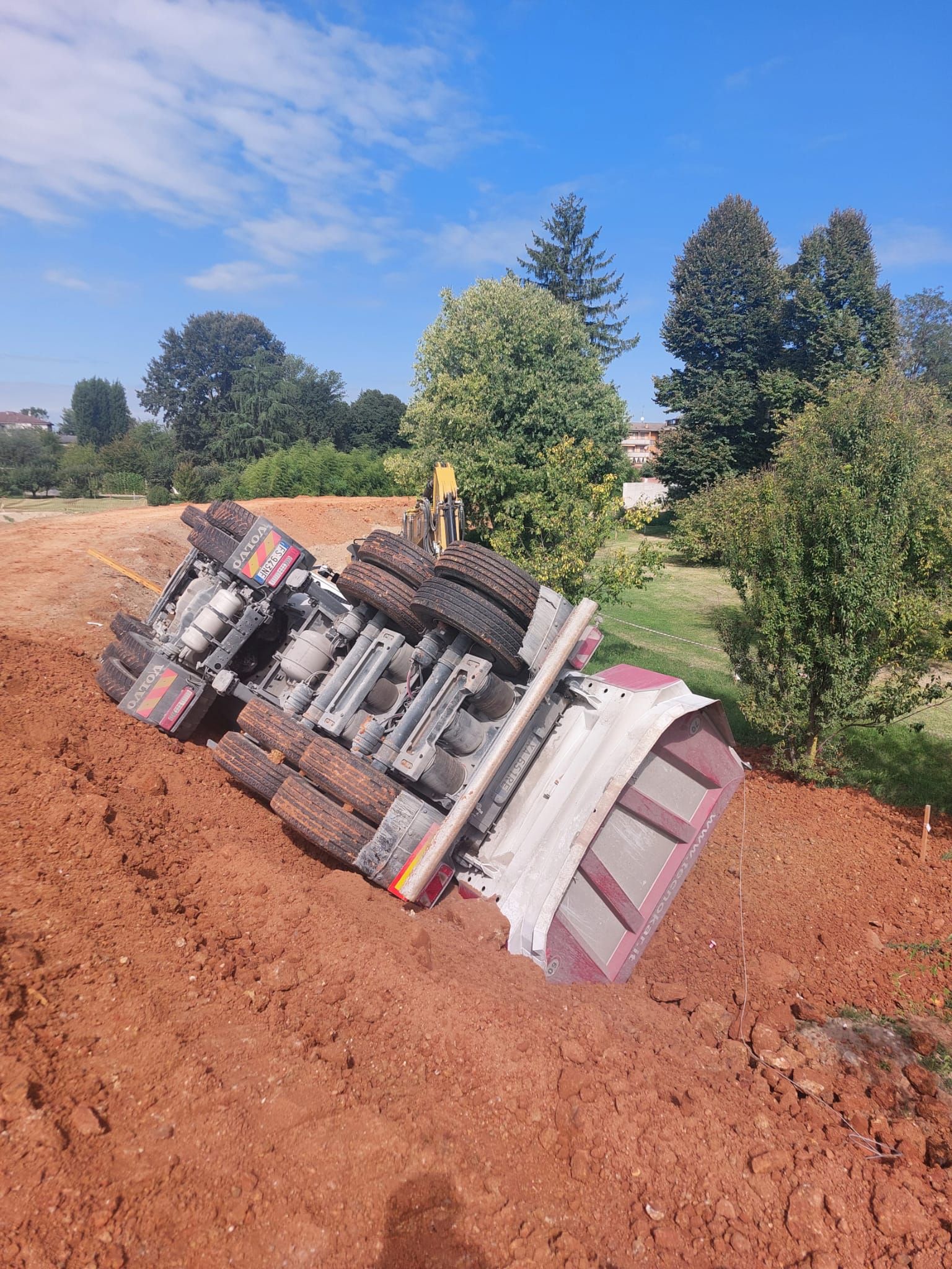Camion ribaltato in cantiere, lievi ferite per il conducente